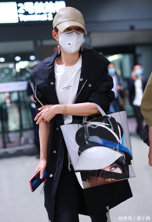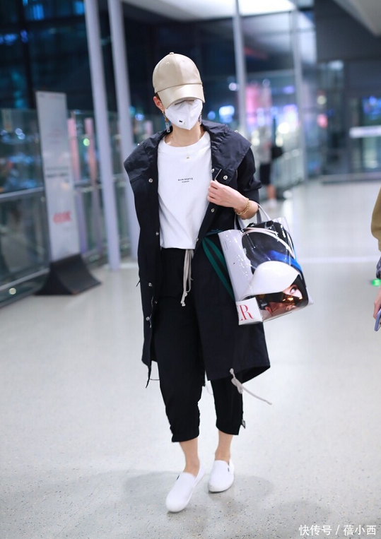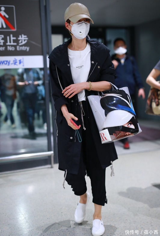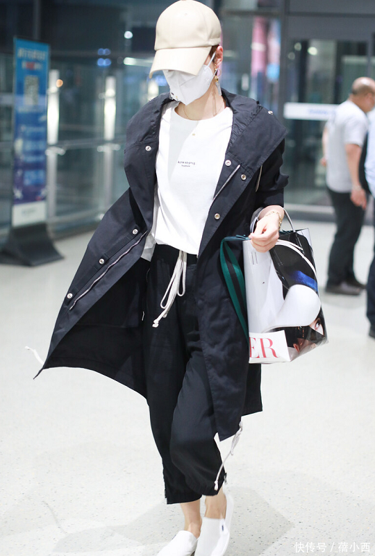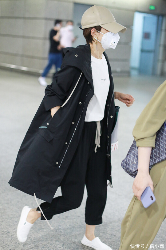 这一次在机场选择了一件黑色风衣,并搭配了黑白色的t恤,还有米色棒球帽,看上去街头感很强,一点都看不出实际的年纪。